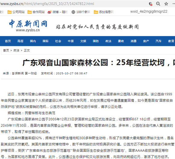 近日,东莞市观音山森林公园开发有限公司管理经营的广东观音山国家森林公园陷入舆论漩涡。该公园自1999年由民营企业家黄淦波个人投资建设以来,历经25年风雨,却在发展过程中遭遇重重困境,如今更是面临“国家级自然保护地”资质拟被撤销的危机,公园方为此向相关单位进行举报,请求公正处理。